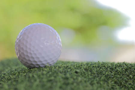 Green grass with golf ball close-up in soft focus at sunlight. Sport playground for golf club concept