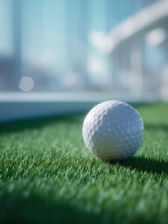one golf ball on practice artificial grass mat under morning sunlight