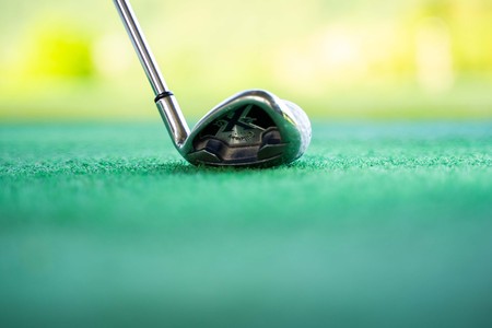 Side view of a golf club and ball lying on an artificial green lawn.