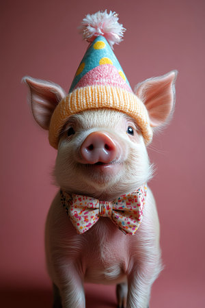 Happy pig in party hat, bow tie, pastel background, festive and joyful vibe