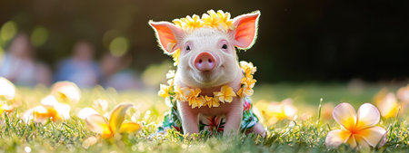 A cute piglet in Hawaiian outfit surrounded by flowers in sunny field