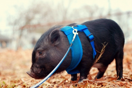 Black mini pig. Domestic pig on a walk. Agriculture