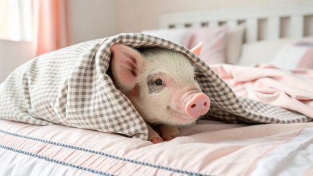 Cute little pig under blanket on bed at home, closeup