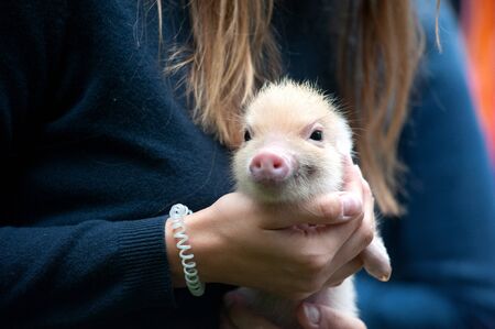A girl holding piglet of mini pig on the hands detail closeup