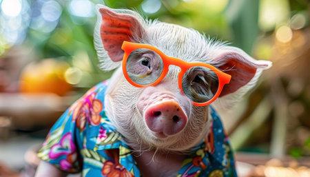 Stylish pig in trendy orange sunglasses and colorful hawaiian shirt, exuding cool vibes