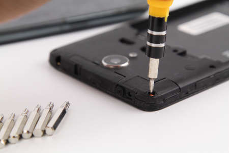 Cell phone repair. Smartphone parts and tools for recovery, selective focus.