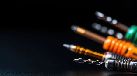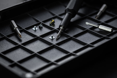 A set of screwdrivers with bits in a case on a dark background. Close up, flat lay, tools for work, copy space.