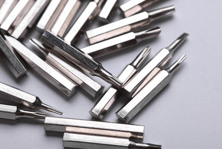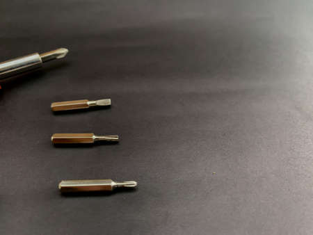 Screwdriver tips different shapes and sizes close up. Manual metal mini screwdriver and set of the interchangeable bits. Precision Screwdriver Kit. Steel Magnetic Bits. home appliance repair kit