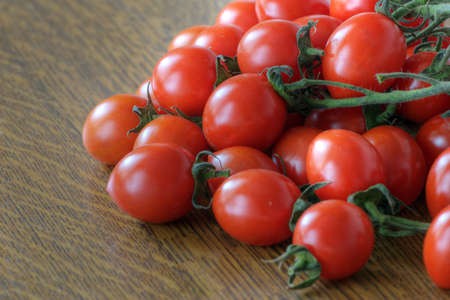 Cocktail tomatoes closeup on a wooden background.