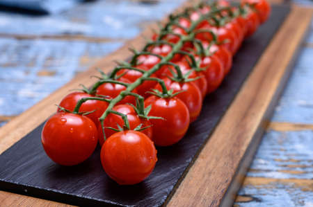 closeup and unfocused background of cherry tomatoes on a slate surface