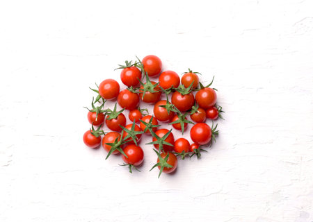 Sprig of ripe fresh cherry tomato on a white background, top view, flat lay