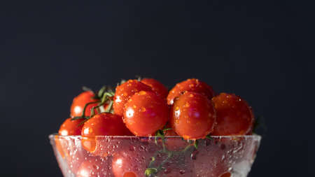 tomatoes with water drops in a glass bowl on a black background, directional lighting. horizontal plane