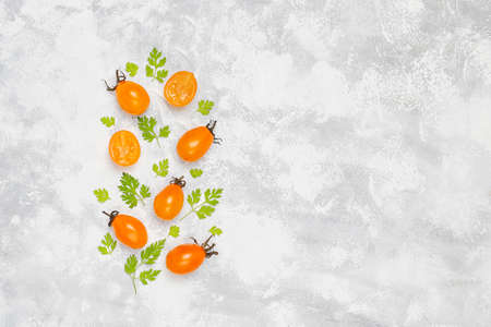 Cherry tomatoes on branch set, on white stone background, top view flat lay, with copy space for text
