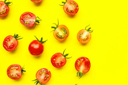 Fresh cherry tomatoes, whole and half cut isolated on yellow background. Copy space