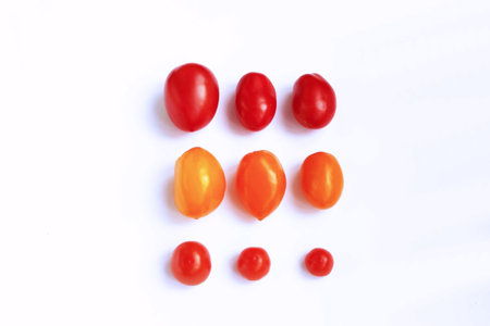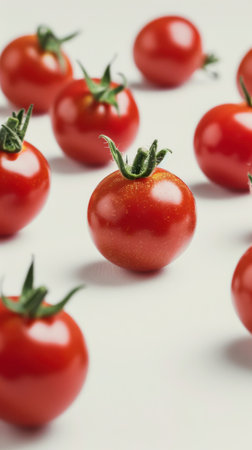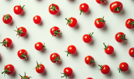There is a vibrant and colorful pattern of fresh tomatoes displayed beautifully against a clean, crisp white background, enhancing their appeal