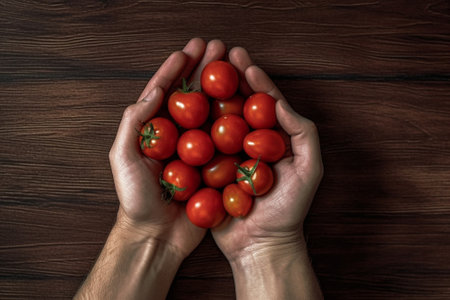 Generative AI : Authentic farmer woman with dirty weathered hands holding a handful of homegrown delicious red mature tomatoes