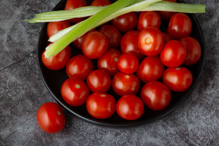 Cherry tomatoes flat lay on black grunge texture abstract background. Food, vegetables photography. Top view, horizontal, neutral vintage moody image style.