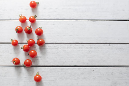 cherry tomatoes scattering on table. fresh salad ingredient. spring and summer vitamin food. low carb diet meal. kids foos for peaky eaters.