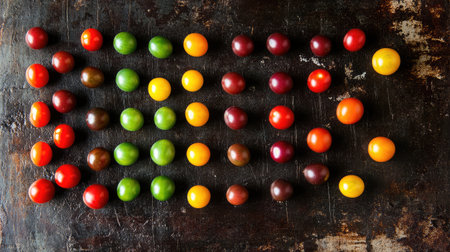 Variety of Fresh Cherry Tomatoes in Rows on Marble Surface.