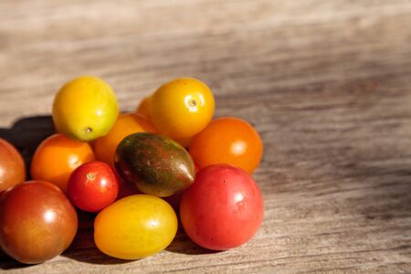 Bright colorful cherry tomatoes in red, yellow, green and purple on the rustic wood background of an old farm table in autumn.
