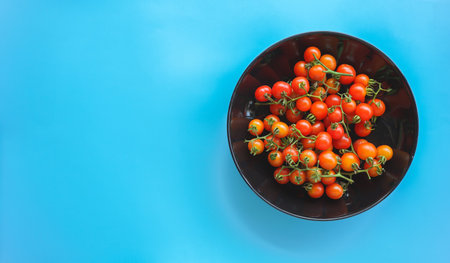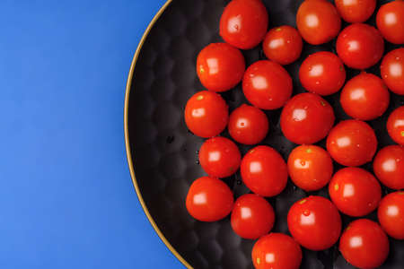Cherry tomatoes in a bowl on blue background. Top view.
