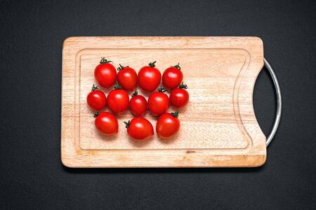 heap tomatoes-cherry on cutting wood board on a black background.