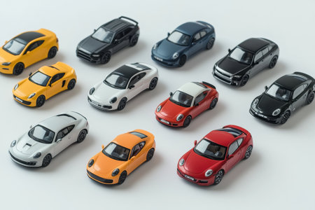 Various colorful miniature car models are neatly arranged on a white background, providing ample space for any text or branding needs.