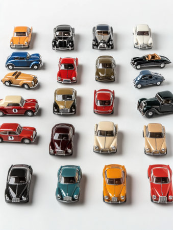 Various miniature car models are neatly arranged on a clean white background, offering space for additional text or branding.