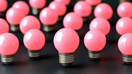 Numerous pink light bulbs with metallic bases, arranged on a dark surface. Each bulb glows, suggesting illumination and ideas.