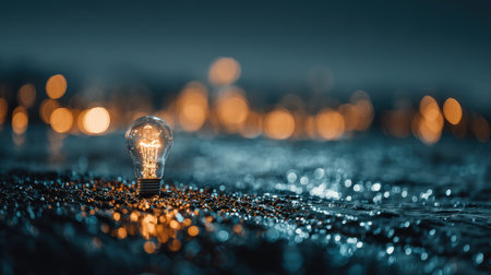 A glowing light bulb rests on textured ground with warm sparks dancing around at dusk.