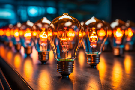 A row of glowing electric lamps in a brightly lit background generated by artificial intelligence