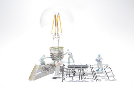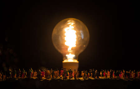 A group of miniature individuals generating a creative business idea under a metaphorical light bulb. Concept Creativity, Miniature Models, Business Ideas, Light Bulb, Teamwork