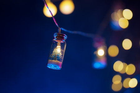 Multicolored bulbs provide soft light creating a cozy and inviting atmosphere. The blurred circles add a dreamlike quality to the warm evening setting.