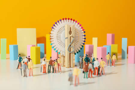 Miniature people standing on colorful wooden blocks with copy space for text