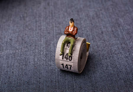 Man figurine and soft measuring tape. tape measure with metric scale
