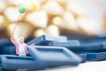 Miniature people : Happy boy holding balloon on the park with gold bokeh background, Concept of happy and leisure time