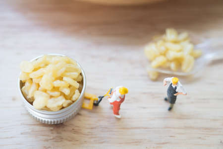 Miniature people chef select best of quality moong dal namkeen fresh and crisp. Concept food for healthy and select best of quality. grains dried vegetarian food ingredient.
