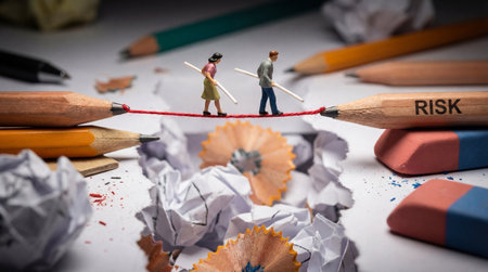 Miniature people : Businessman and businesswoman standing on rope between crumpled paper and pencils