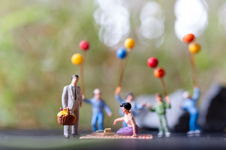 Miniature people : Happy family sitting on the mat during a picnic in a park