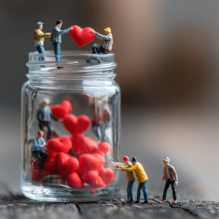 Tiny people give red hearts to glass jar, donate love gifts, share solidarity, hope and kindness