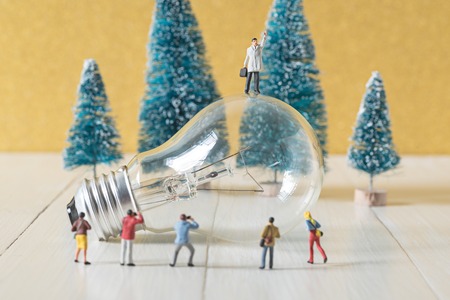business miniature standing on a top of vintage light bulb