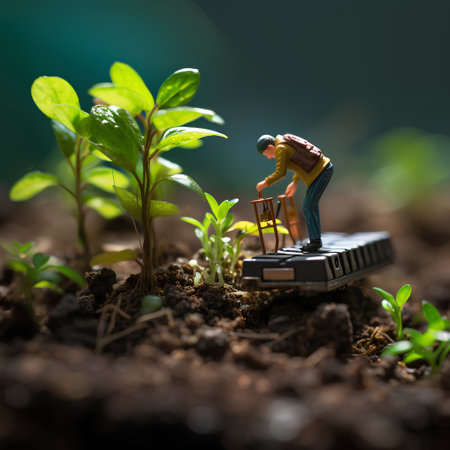 Miniature figures are engaged in a playful scene, tending to a green garden, creating a whimsical atmosphere filled with creativity and imagination.