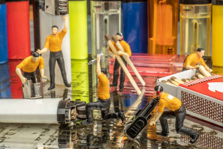 Industry concept with miniature human figures working in gas lighter repair and production