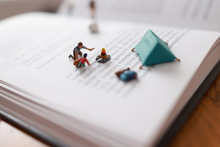 Tiny figures sit on a bench, engaged in reading, surrounded by greenery