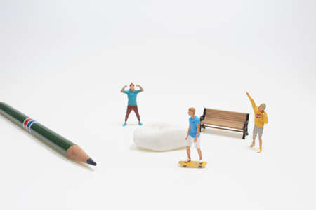 Close up miniature people waiting train at early morning rush hours, busy modern life concept. Thailand public transportation concept