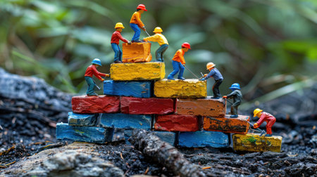 Miniature figures of construction workers building a colorful brick wall in a forest setting.