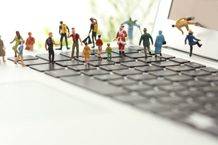 Miniature people standing in line with a blurred background, AI