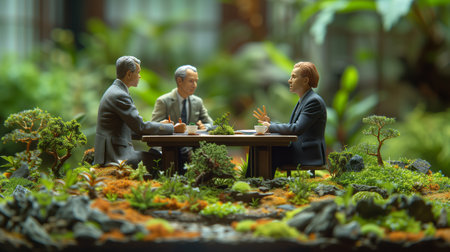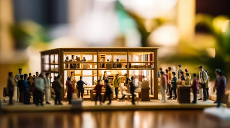 Miniature figures in business suits gather in a cafe standard illustration capturing a business meeting or casual networking in a cozy setting.