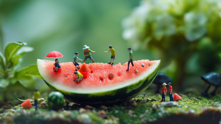 Miniature people : Farmer working with watermelon on the ground.