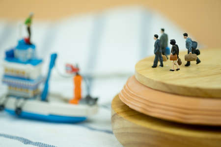 Miniature people: Passenger go to vehicle for go to destination by Thai boat. Image use for business background concept.
